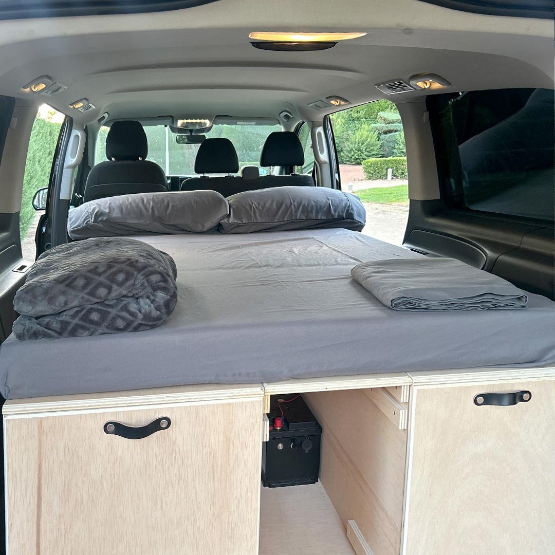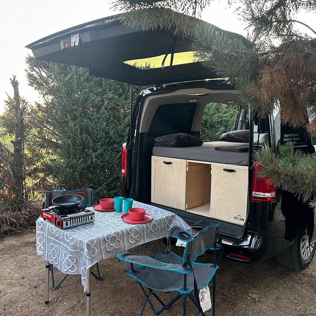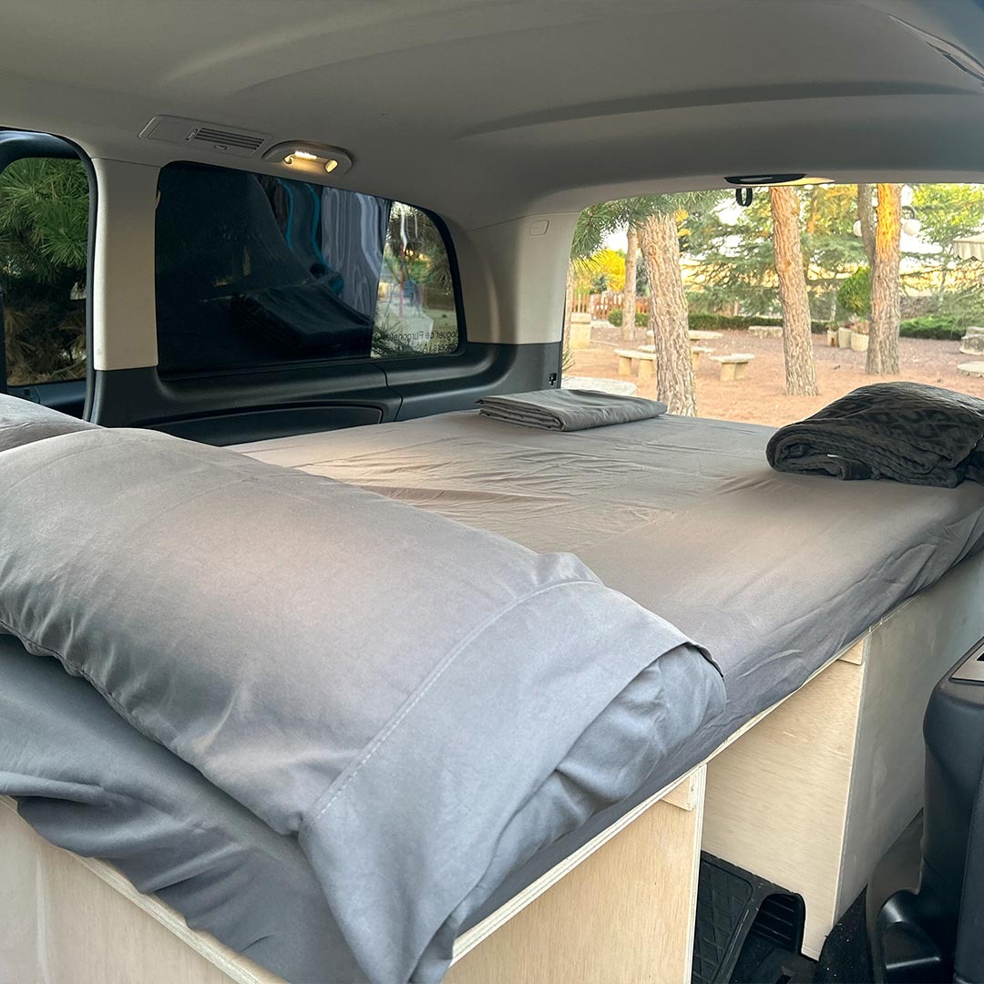 Además, el kit de camperización te ofrece todo lo que necesitas para convertir cada parada en una experiencia cómoda. Cuenta con una placa de cocina y los utensilios necesarios para preparar tus comidas al aire libre, junto con una nevera para mantener frescos tus alimentos y vajilla para disfrutar con estilo. Por la noche, descansarás plácidamente con la ropa de cama incluida (¡recuerda traer tus propias toallas!).